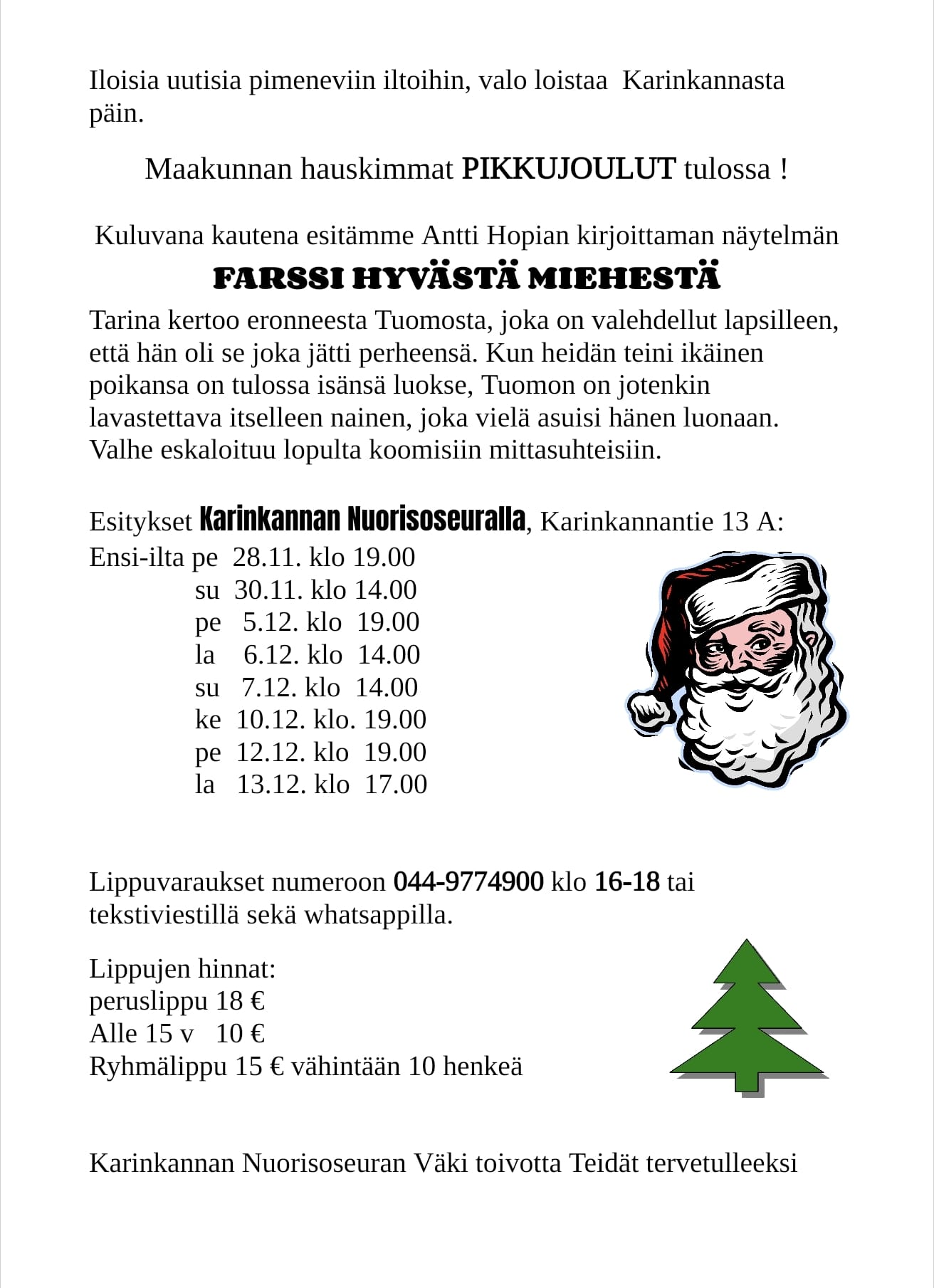 Varaa lippusi soittamalla klo 16-18 ja muina aikoina tekstiviestillä tai Whatsapilla.
